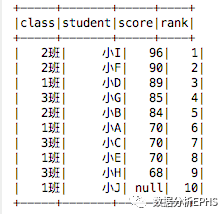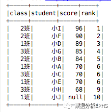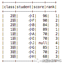 再来看下rank,使用rank进行排序,如果排序列取值相同,那么其排名相同,假设有3名同学排名第1,那么下一名同学的排名直接变为第4。通过sql验证下:
