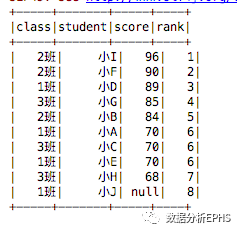 可以看到,小A、小C和小E的排名都是第6,小H排名是第7而非第9。同时对于null值的排序跟row_number()相同。