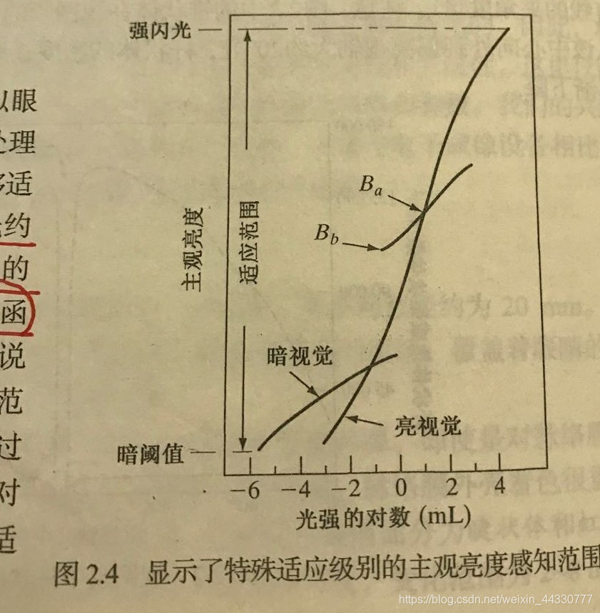 人眼对亮度的适应范围从暗阈值到强闪光约有方个量级。主观亮度是进入人眼的光强的对数函数,分为暗视觉和亮视觉。视觉系统不能同时在一个范围内工作,需通过改变整个灵敏度来完成这一较大的变动,也就是亮度适应。马赫带效应:在明暗交界的地方,亮区一侧的抑制作用大于暗区的抑制作用,从而产生暗区更暗,亮区更亮。