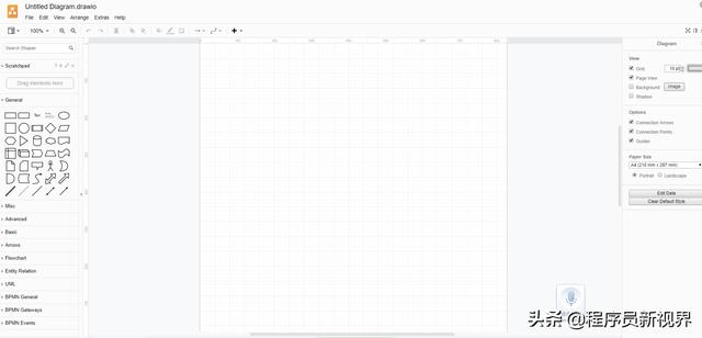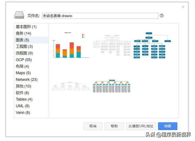 draw.io提供了不同种类的流程图和图表模板,包括:商务、图表、工程图、流程图、GCP 、布局、网络、软体、UML 、维恩等待。