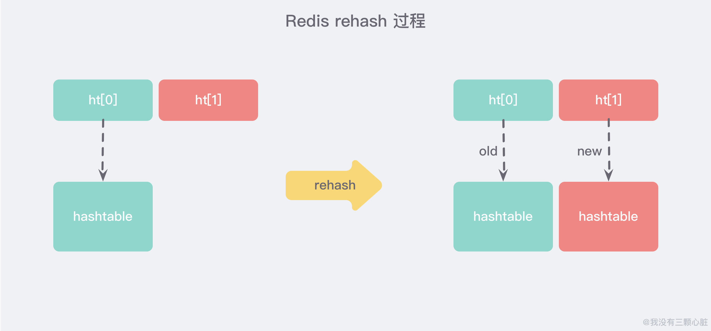 渐进式 rehash 会在 rehash 的同时,保留新旧两个 hash 结构,如上图所示,查询时会同时查询两个 hash 结构,然后在后续的定时任务以及 hash 操作指令中,循序渐进的把旧字典的内容迁移到新字典中。当搬迁完成了,就会使用新的 hash 结构取而代之。