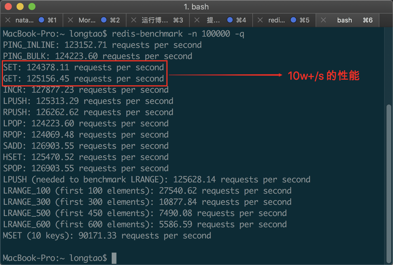 当你安装完成之后,你可以先执行 redis-server 让 Redis 启动起来,然后运行命令 redis-benchmark -n 100000 -q 来检测本地同时执行 10 万个请求时的性能:
