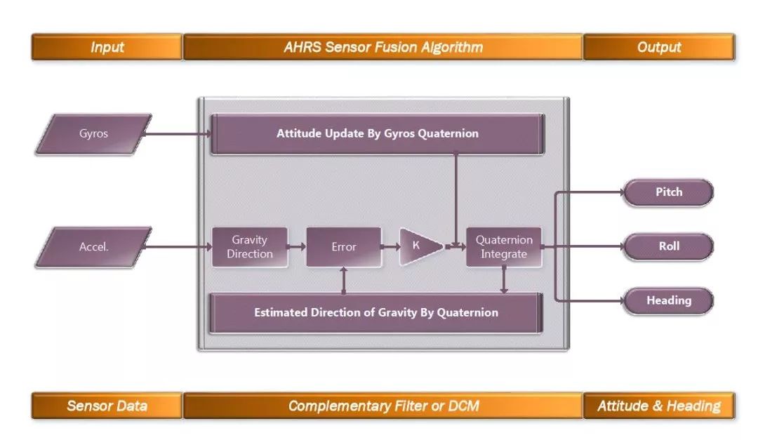 姿态编排使用的是AHRS(Attitude andheading reference system )融合算法,处理后输出车机姿态信息。姿态编排流程如图6所示: