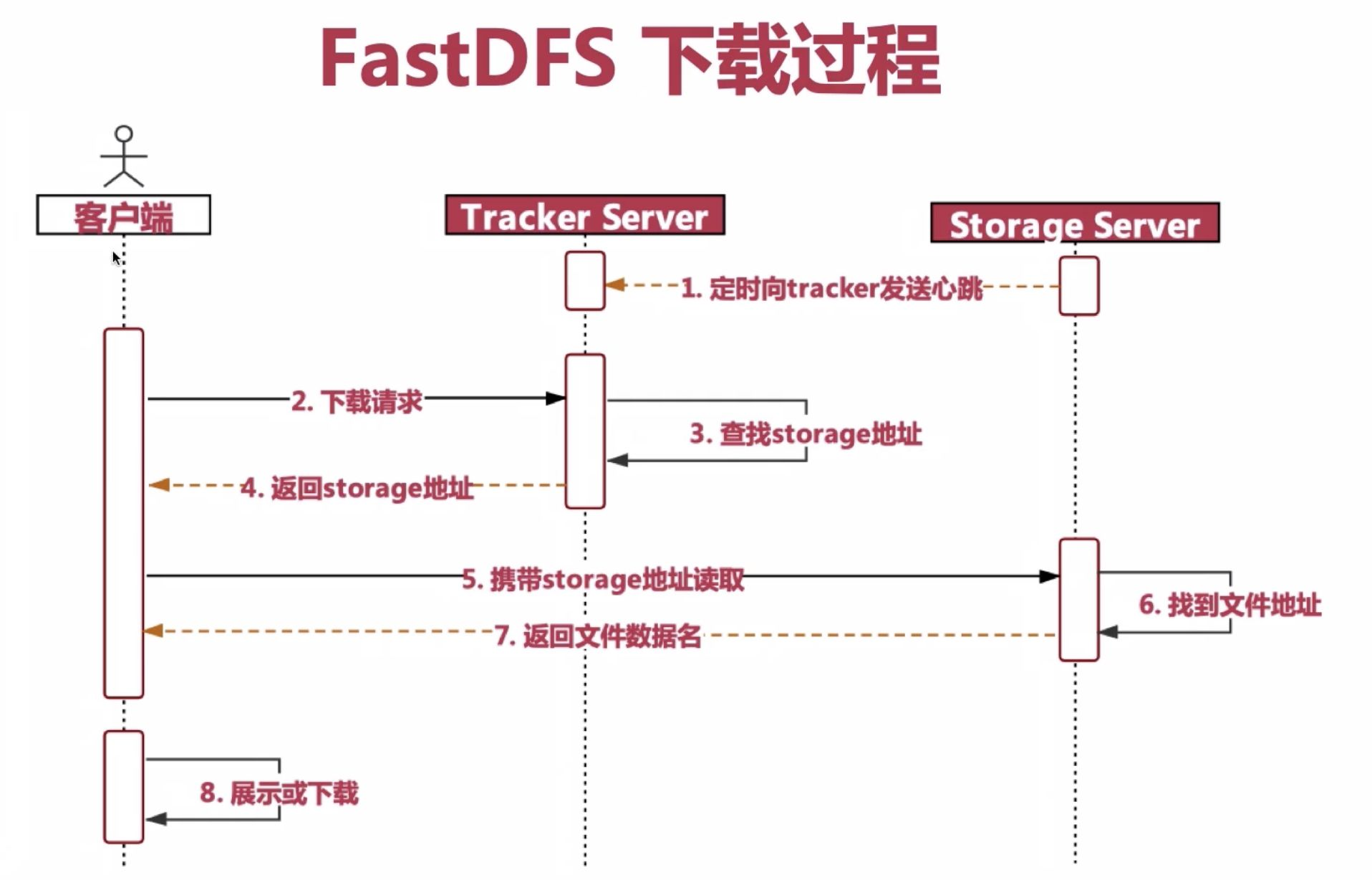 Storage Server 定期向Tracker Server 发送状态信息,保持心跳连接。