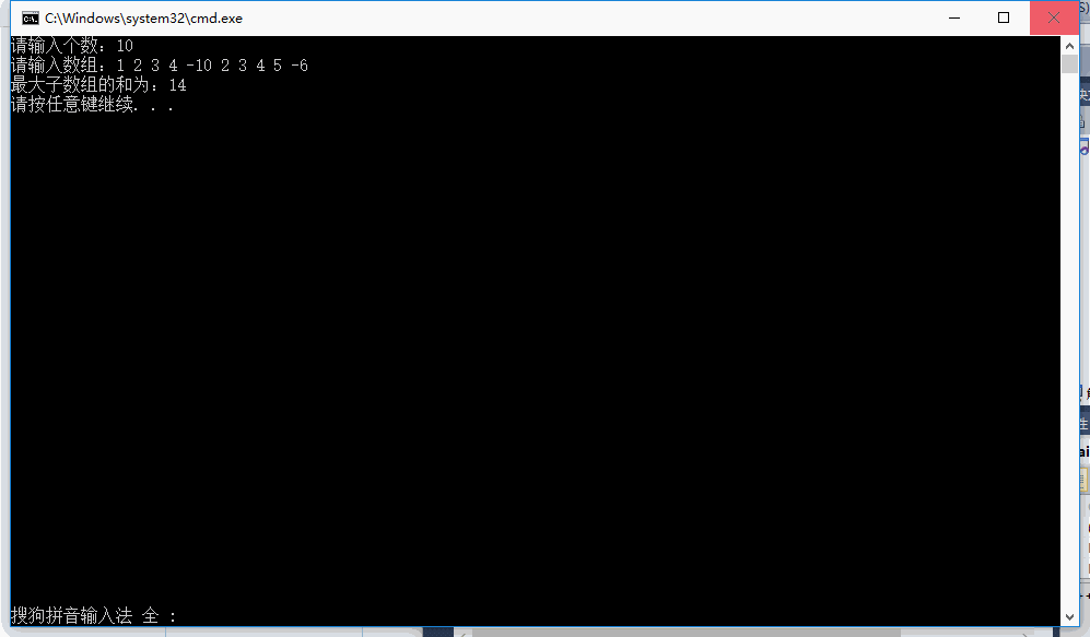 #include<iostream> using namespace std; int max(int a,int b) { if(a>b) {return a; } else {return b; } } int maxsum(int a,int n) { int i; int maxsofar=0;//maxsofar记录到目前为止的最大值 int maxendinghere=0;//maxendinghere记录从当前位置开始网前几个连续的数的和的最大值 for(i=0;i<n;i++) { maxendinghere=max(maxendinghere+a[i],0); maxsofar=max(maxsofar,maxendinghere); } return maxsofar; } int main() { int n,a i=0; cout<<"请输入数组:"; cin>>a[i]; int max=maxsum(a,n); cout<<最大子数组的和为:"<<max<<endl; return 0; }