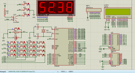 该抢答器硬件由 6 个部分组成时钟频率电路、复位电路、蜂鸣器电路、按键电路、LCD1602显示电路、数码管显示电路组成。