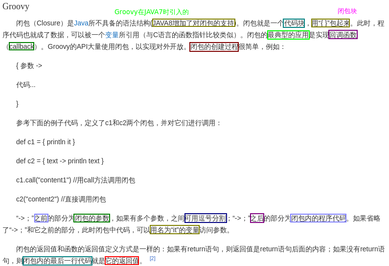 通俗理解: Groovy的闭包更象是一个"代码块"或者"方法指针",代码在某处'被定义'然后在其后的'调用处'执行