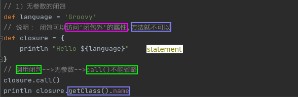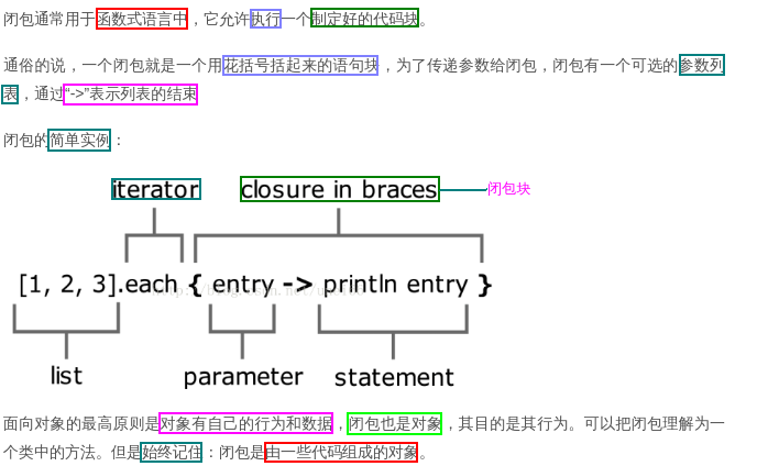 更通俗: 闭包在groovy中是一个'处于代码上下文'中的开放的、匿名代码块,它可以'访问'到其'外部'的变量或方法(2)粗略理解