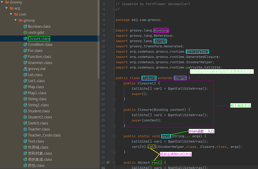 2)每个'闭包'会被编译成'继承'groovy.lang.Closure 类的类-->具体查看'编译后的.class文件'