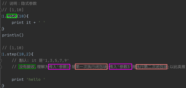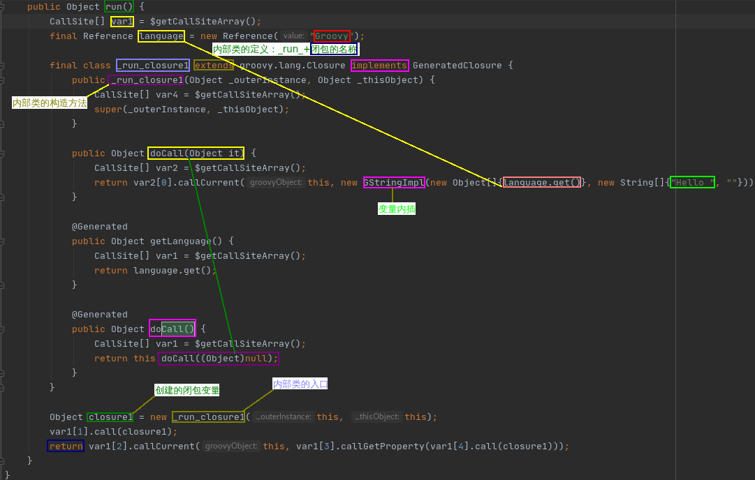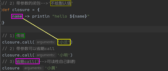 3)最后groovy编译器都会把编译成对'doCall()方法'的调用,这是groovy对闭包的一个隐藏方法,通过该方法可以'传递参数'并'调用这个闭包'(1)创建闭包