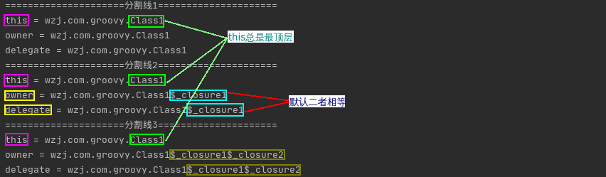 // 5)打印outerClosure闭包对应的this,owner,delegate对象和outerClosure对象的'toString方法'
