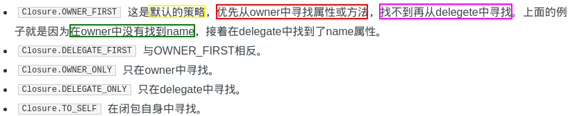 在闭包中,当一个'属性'或者'方法'没有'指明其所有者'的时候,delegate策略就会发挥作用了