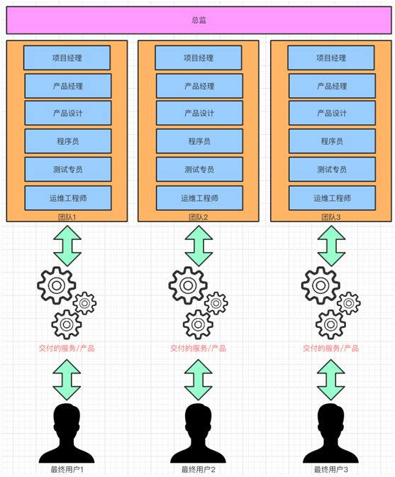 产品型:随着产品意识的不断提升,人们不再拘泥于之前的矩阵型组织结构了,于是加入了产品和产品经理,更重要的是把客户也纳入到组织当中。