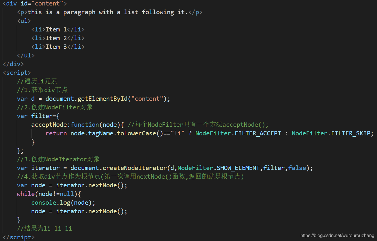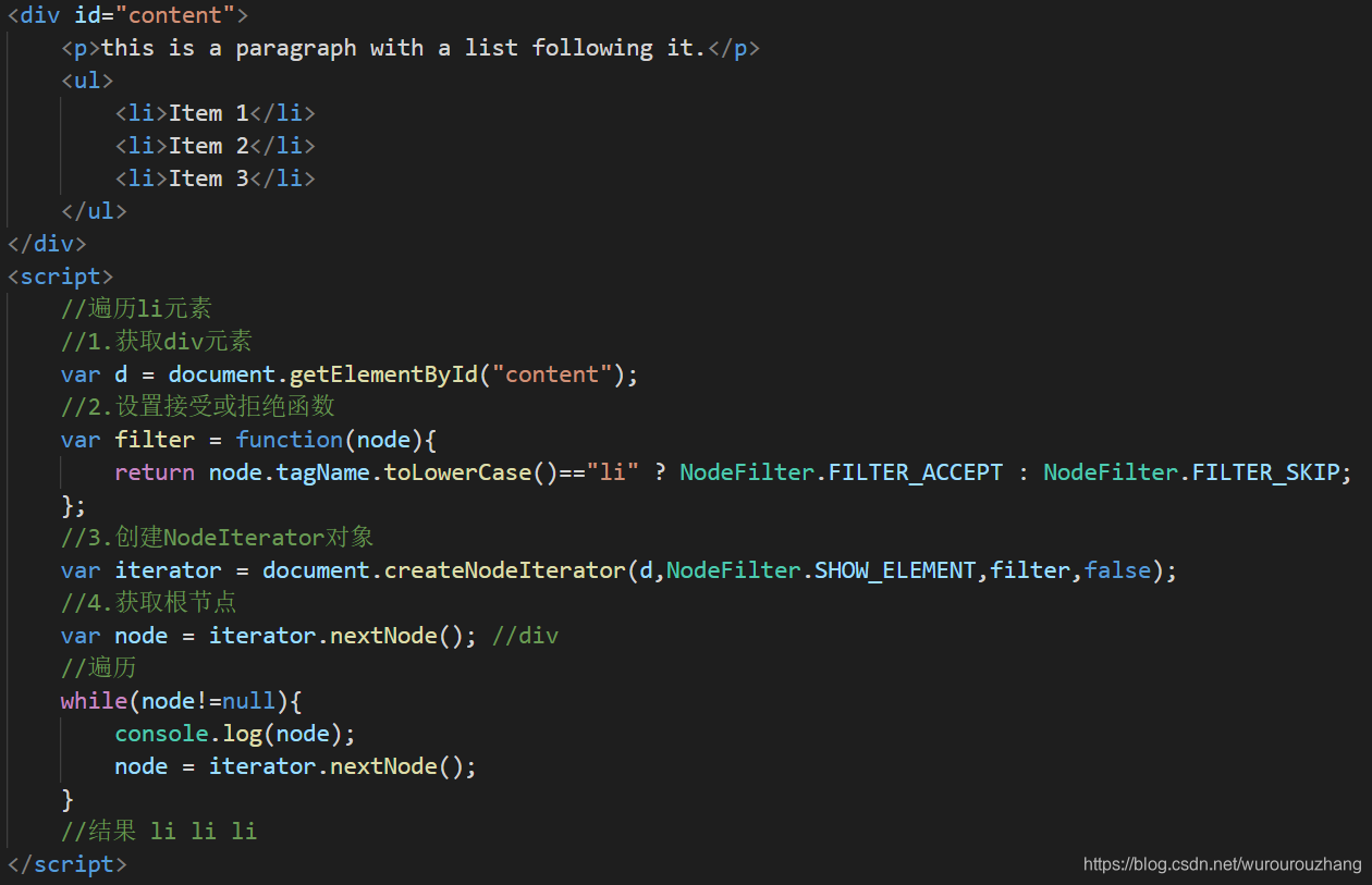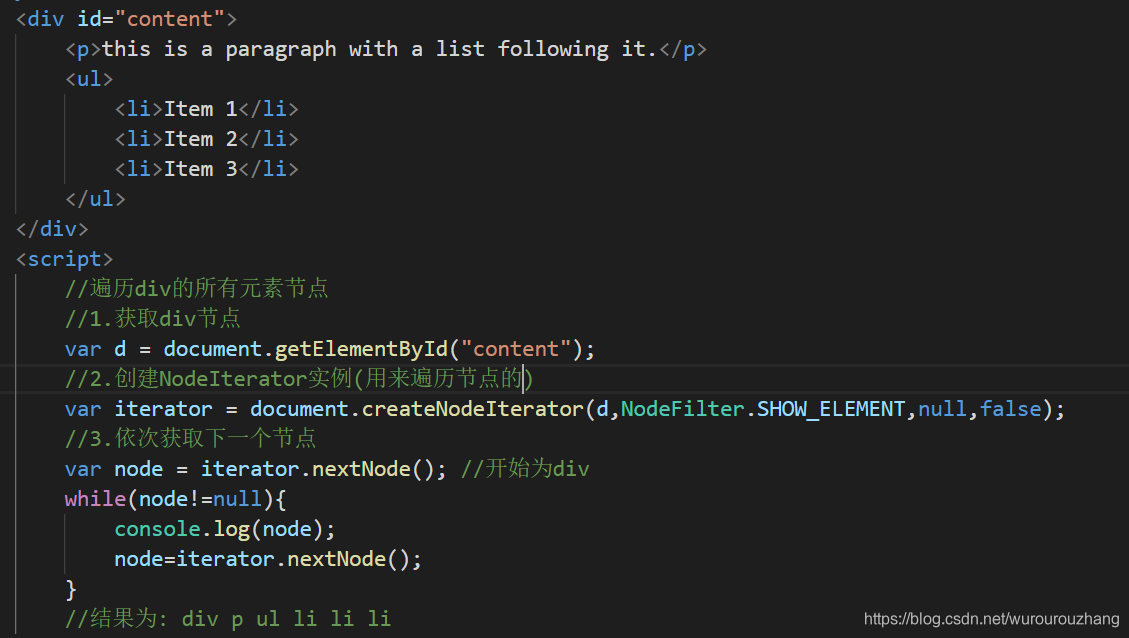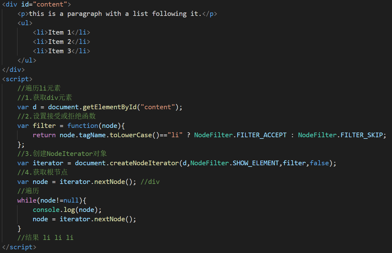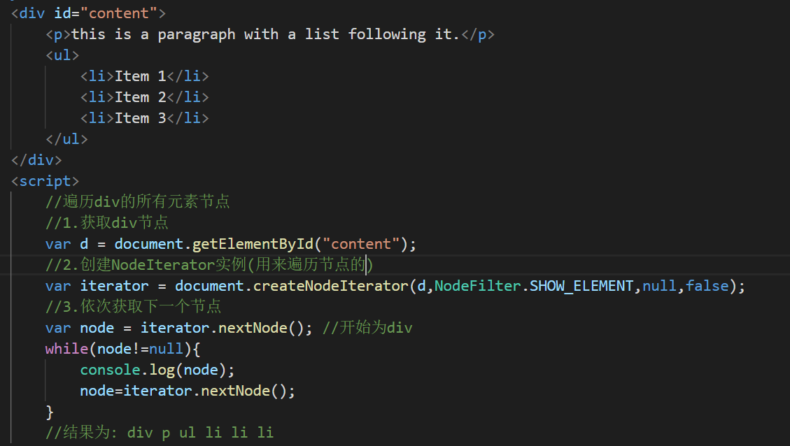 使用document.createNodeIterator(root,whatToShow,filter,entityReferenceExpansion)函数来创建NodeIterator实例。