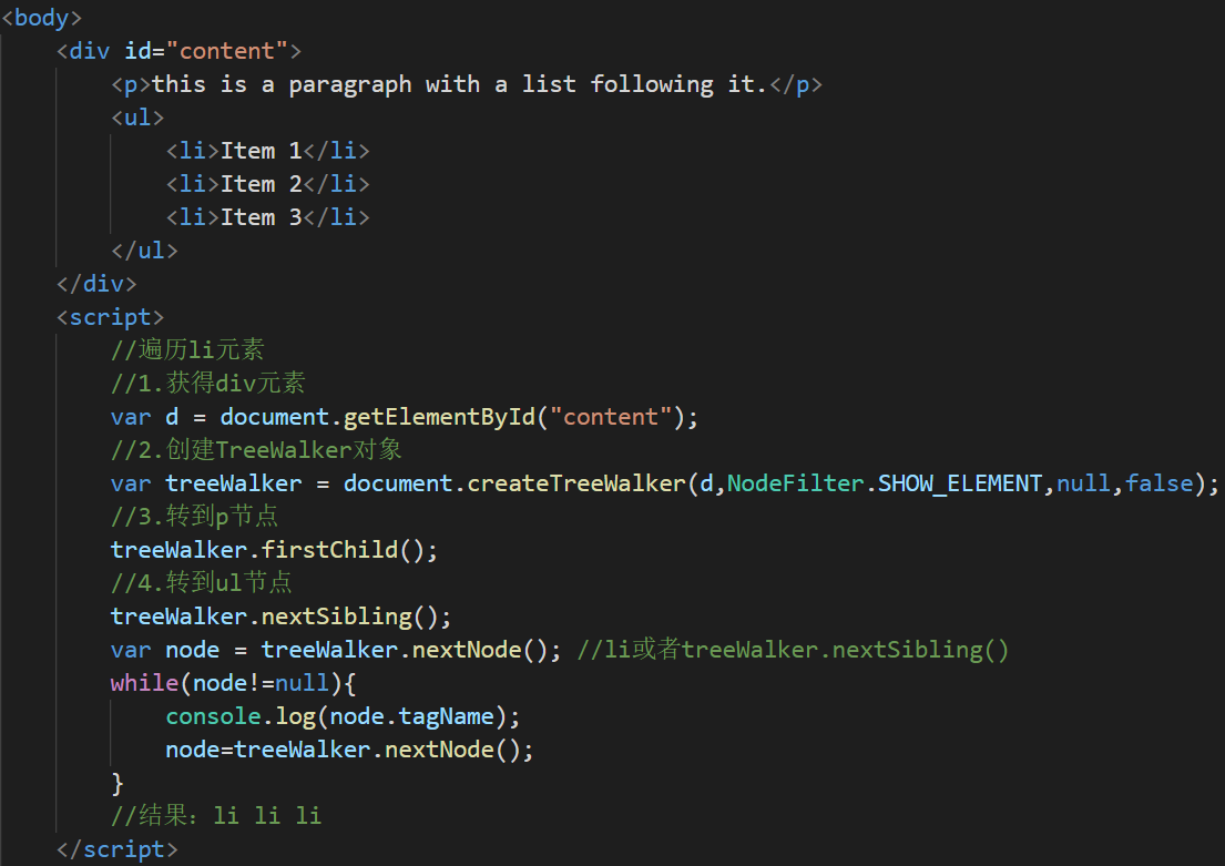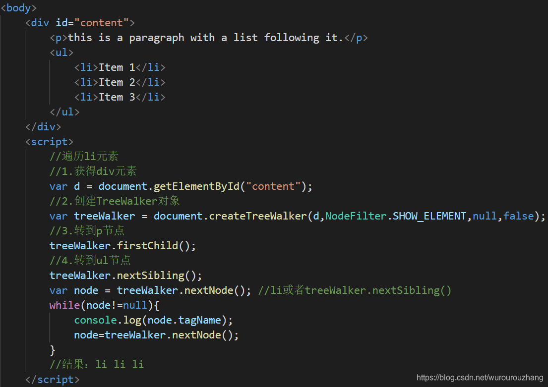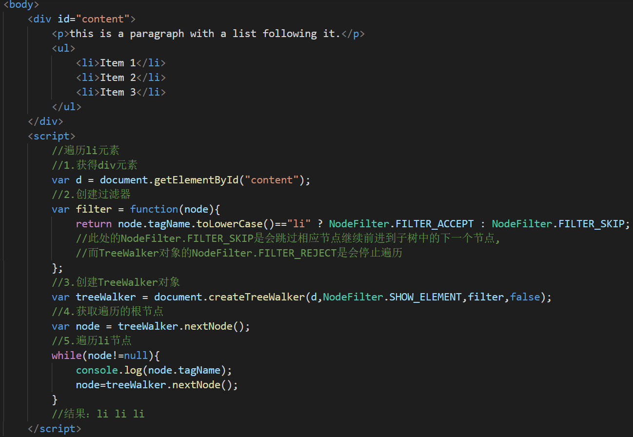 使用document.createTreeWalker(root,whatToShow,filter,entityReferenceExpansion)创建TreeWalker对象