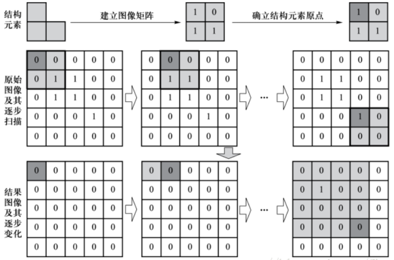 B依顺序在A上移动(和卷积核在图像上移动一样,然后在B的覆盖域上进行形态学运算),当其覆盖A的区域为[1,1;1,1]或者[1,0;1,1]时,(也就是B中‘1’是覆盖区域的子集)对应输出图像的位置才会为1。