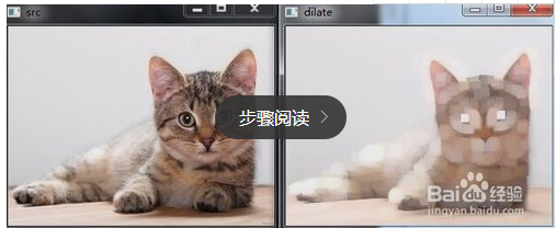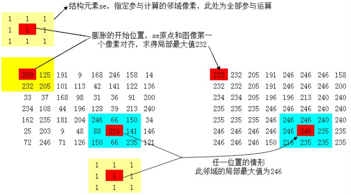 因此,膨胀可以使一个孤立的高亮噪音扩大化;可以使用物体的一些低亮度的关键细节丢失。