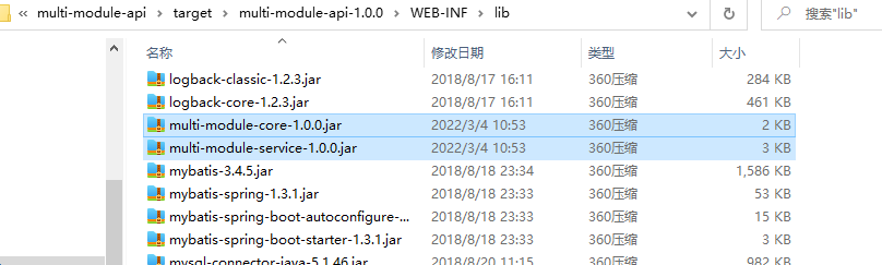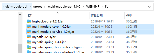 打包之后的文件如下图所示,后续更新只需要替换multi-module-core和multi-module-service的jar包即可: