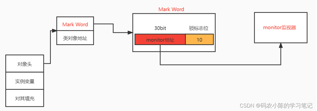 上一章说了对象的基本结构,以及对象头中的Mark Word的含义,其中非常重要的就是当Mark Word中最后两位的锁标志位是10的时候,Mark Word的前面是monitor监视器的地址,我现在就给你画出来对象头、Mark Word 和 monitor之间的关系图: