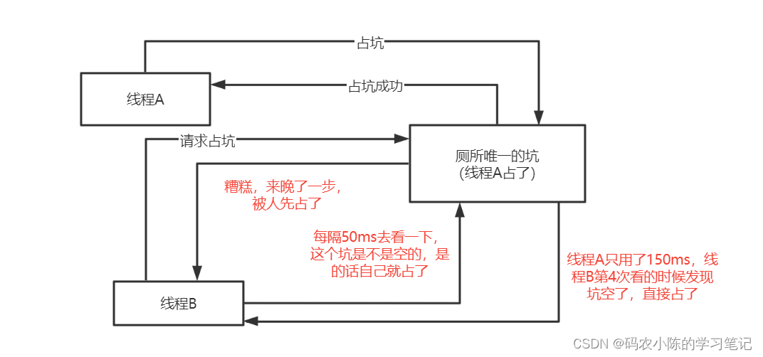 (2)但是如果线程A拉肚子了,这家伙在里面蹲了一个多小时....,线程B尝试了10次之后,发现坑还是没有空的。这个时候线程B发现自己还有好多代码没写,害~,不等了,先释放CPU去写写代码,待会再来看看......