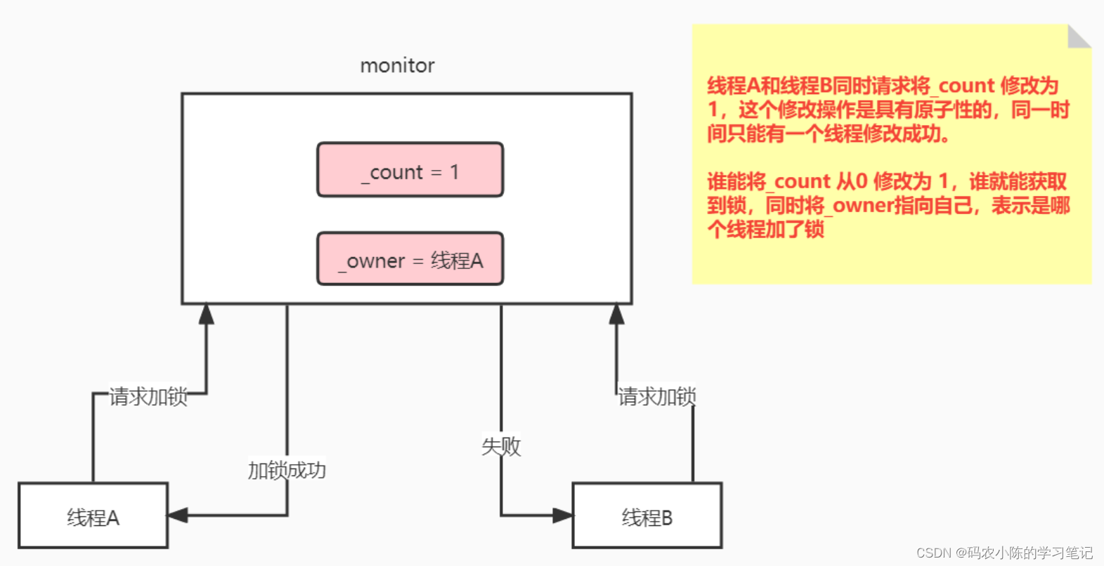 在_count = 0,_owner = null的时候,表示monitor没人加锁,这个时候线程A和线程B同时请求加锁,也就是竞争将_count改为1,由于线程A这哥们动作比较快,它将_count改为1,获取锁成功了。它还嘚瑟了一下,同时将_onwer = 线程A,表示自己获取了锁,告诉线程B,兄弟不好意思了,是我获取了锁,我先去操作了。