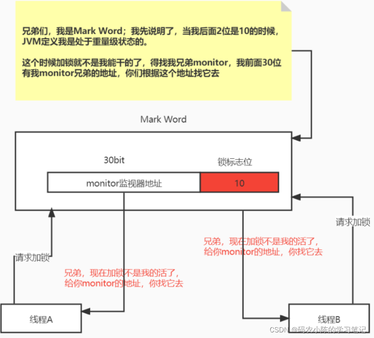 当Mark Word的最后两位的锁标志位是10的时候,Mark Word这哥们说自己处于重量级锁的模式,重量级加锁不是它的责任,是monitor的责任,它作为mark word记录的数据是monitor的地址,让我们自己去找monitor去进行加锁。