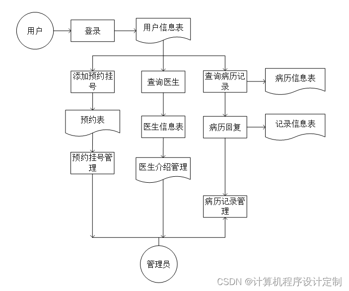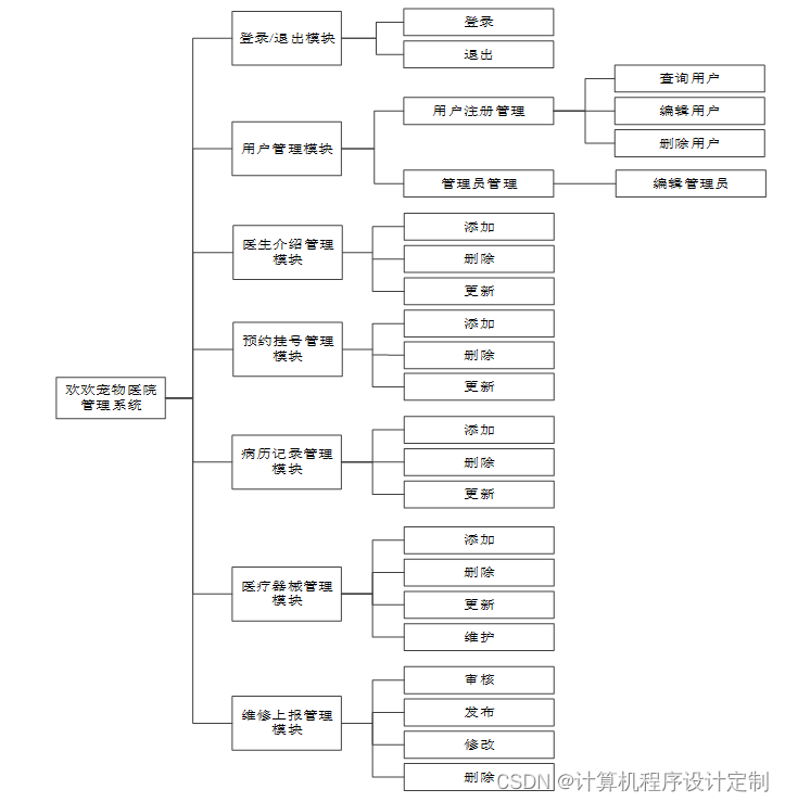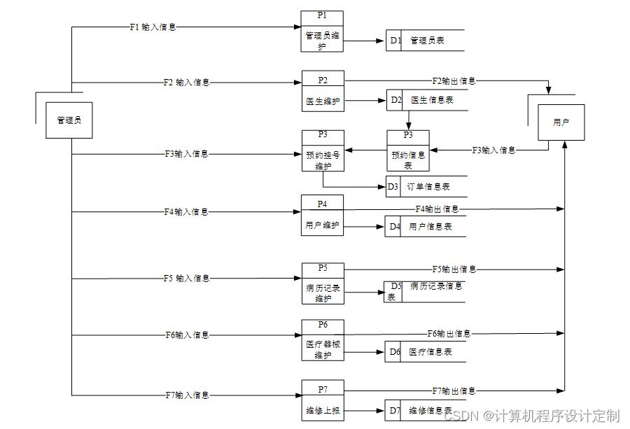 欢欢宠物医院管理系统底层数据流图主要描述系统底层模块的数据流、数据载体、数据处理、外部实体的具体交互。本系统就是管理员和普通用户在用户管理、预约挂号、病历记录、医疗器械、维修上报等模块上的数据交互。
