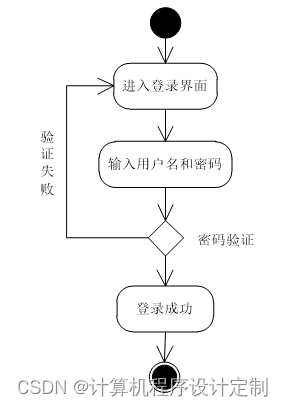 用户可进行登录使用更多功能,首先进入用户登录界面,输入用户账号和密码,后台对账号和密码信息进行核对验证,验证成功则页面直接显示登录用户昵称代表登录成功,否则返回用户登录界面。用户登录活动图如下图。