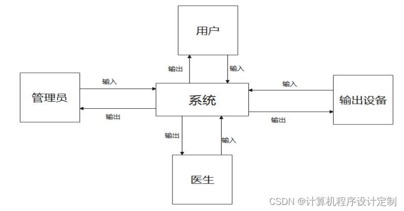 如下为系统的顶层数据流图,外部实体有用户和管理员,分别对系统输入数据,从而得到要输出的数据。