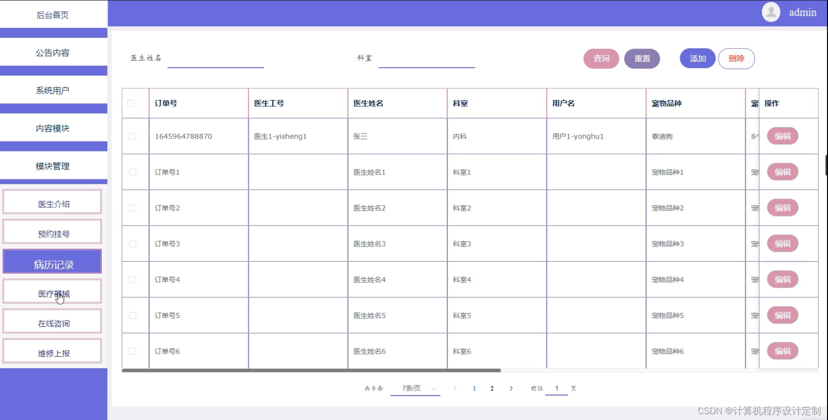 病历记录信息管理:对病历记录信息进行维护,添加、删除、修改信息。