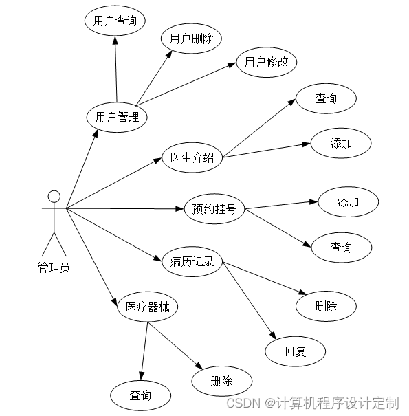 2.管理员主要负责用户管理、宠物医疗管理、商品管理、商品订单管理、宠物领养,下图所示描述管理员的用例图。