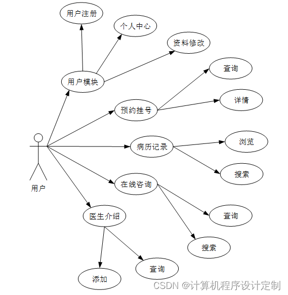 用户登录后,进入功能页面,可对自己的信息进行管理,包括个人信息,预约挂号、病历记录、在线咨询。用户使用功能活动图如下图所示。