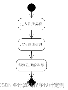 用户管理针对所有用户和管理员。未注册用户点击注册,进入注册页面填写新用户信息,得到自定义生成账号后,注册完成。未注册用户注册的活动图如下图所示。