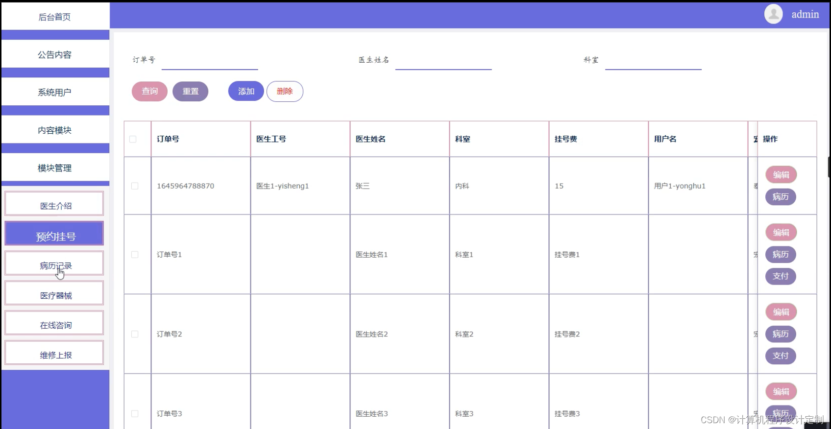 预约挂号:用户可以查看预约信息表的挂号状态,可以根据预约状态发起挂号申请:包括填写订单号、医生工号、医生姓名、科室、挂号费、用户名。