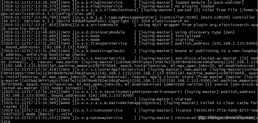 在该配置文件的末尾复制添加上如下信息即可,省的一个个找修改再取消注释,如下信息其实就是该文件中需要修改的汇总,为了简便,可以直接复制添加。# 集群的名字,需要自定义,如果是想要搭建es集群,则保持此项相同即可 cluster.name: luying # 节点名字,需要自定义,如果想要搭建es集群,则保证此项不同即可 node.name: luying-master # 是否是master node.master: true # ES的监听地址,这样别的机器也可以访问,有的教程说此项设置成0.0.0.0代表任意ip都可以访问本es,但失 # 败了,还是写成本机ip为正确写法,不要写成localhost,那样其他ip无法访问,一定要写固定ip network.host: 192.168.2.133 # 默认的就好,es启动后通过web访问es,只需输入ip:9200,出现一个json即代表成功 http.port: 9200 # 本机最大允许运行节点个数,默认即可 node.max_local_storage_nodes: 3 # 增加新的参数,这样head插件可以访问es,解决跨域访问问题,一把用不到 # http.cors.enabled: true # http.cors.allow-origin: "*"启动:./elasticsearch-6.3.1/bin/elasticsearch(注意一定要用普通用户启动才可以)