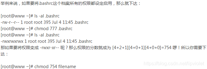 各权限的分数对照表如下: r:4 w:2 x:1;每种身份(owner/group/others)各自的三个权限(r/w/x)分数是需要累加的,下面则是常用的权限示例