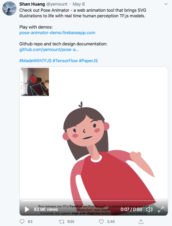 最近,一个名为「Pose Animator」的项目人气暴增,打开以后,我们发现这又是一个能让人自娱自乐,并且丝毫察觉不到时间流逝的神奇工具。