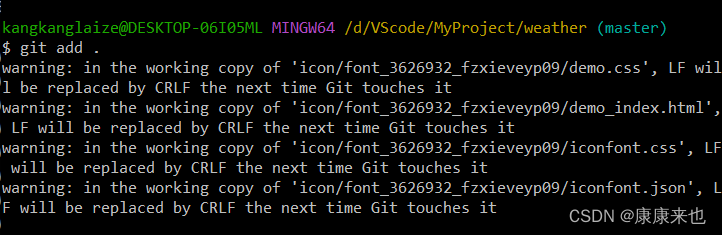 问题1:将文件放置暂存区时出现warning: in the working copy of 'icon/font_3626932_fzxieveyp09/demo.css', LF will be replaced by CRLF the next time Git touches it,在第二次输入git add . 成功了。
