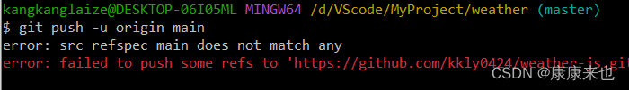 问题3:src refspec main does not match any,在将本地文件传入仓库时,出现main没有匹配到任何。原因在于本地文件默认主分支名为master,无法与仓库的主分支main进行匹配。
