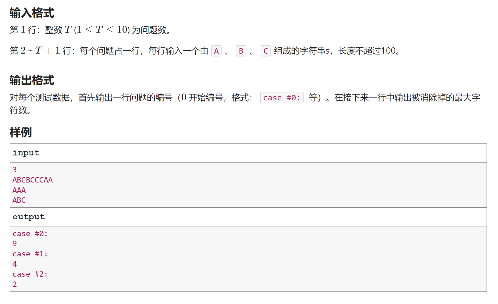 例如字符串ABC,分别求AABC、ABBC、ABCC消除掉的字符总数,输出其中的最大值。