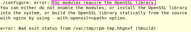'原因': 在编译 Nginx 时遇到这样的错误,明显是'缺少 openssl 环境',需要手动安装