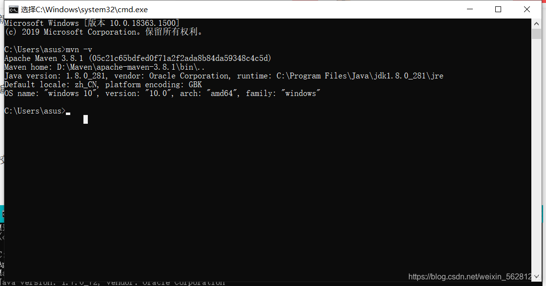 打开cmd 命令窗口,输入 mvn -v 或 mvn -version,显示如下信息即安装成功。