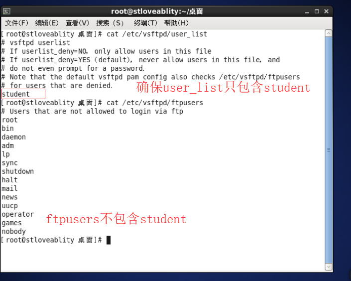 - 3)检查/etc/vsftpd/ftpusers文件,确保不含student用户名。
