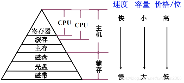- 辅助存储器(外存):外存存放系统程序和大型数据文件及数据库存储容量大,单位成本低。