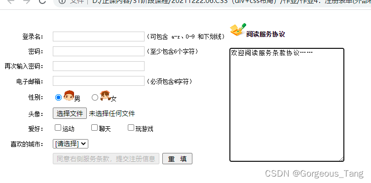 <!DOCTYPE html PUBLIC "-//W3C//DTD XHTML 1.1 Transitional//EN" "http://www.w3.org/TR/xhtml1/DTD/xhtml1-strict.dtd"> <html xmlns="http://www.w3.org/1999/xhtml"> <head> <meta http-equiv="Content-Type" content="text/html; charset=gb2312" /> <title>商城注册</title> <link rel="stylesheet" type="text/css" href="css/layout.css" /> </head> <body> <form method="post" action="" id="regform"> <table> <tbody> <tr> <td colspan="3"> </td> <td rowspan="11"> <h4><img src="images/read.gif" alt="alt" />阅读服务协议</h4> <textarea class="text" name="textarea" cols="30" rows="15" readonly="readonly">欢迎阅读服务条款协议……</textarea> </td> </tr> <tr> <td class="hint">登录名:</td> <td><input class="text" name="sname" type="text" size="24" />(可包含 a-z、0-9 和下划线)</td> </tr> <tr> <td class="hint">密码:</td> <td><input class="text" name="pass" type="password" size="26" />(至少包含6个字符)</td> </tr> <tr> <td class="hint">再次输入密码:</td> <td><input class="text" name="rpass" type="password" size="26" /></td> </tr> <tr> <td class="hint">电子邮箱:</td> <td><input class="text" name="email" type="text" size="24" />(必须包含@字符)</td> </tr> <tr> <td class="hint">性别:</td> <td> <input name="gen" type="radio" value="男" checked="checked" /><img src="images/Male.gif" alt="alt" />男 <input name="gen" type="radio" value="女" /><img src="images/Female.gif" alt="alt" />女 </td> </tr> <tr> <td class="hint">头像:</td> <td><input type="file" name="upfiles" /></td> </tr> <tr> <td class="hint">爱好:</td> <td> <input type="checkbox" name="checkbox" value="checkbox" />运动 <input type="checkbox" name="checkbox2" value="checkbox" />聊天 <input type="checkbox" name="checkbox3" value="checkbox" />玩游戏 </td> </tr> <tr> <td class="hint">喜欢的城市:</td> <td> <select name="nMonth"> <option value="" selected="selected">[请选择]</option> <option value="0">北京</option> <option value="1">上海</option> </select> </td> </tr> <tr> <td> </td> <td> <input type="hidden" name="from" value="regForm" /> <input type="submit" name="Button" value="同意右侧服务条款,提交注册信息" disabled="true" /> <input type="reset" name="Reset" value=" 重 填 " /> </td> </tr> </tbody> </table> </form> </body> </html>案例二:普林斯顿大学首页首页布局
