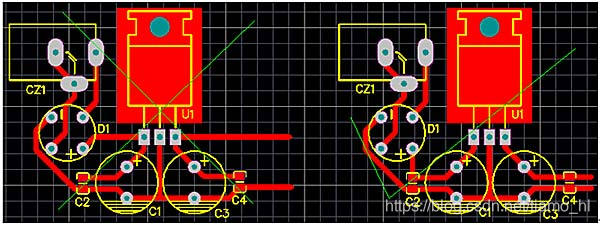 PCB设计时,元件的布局要紧凑,要让所有的连线尽可能短,要按原理图元件功能关系去布局元件与走线。本电源图里就是先整流、再滤波、滤波后才是稳压、稳压后才是储能电容、流经电容后才给后面的电路用电。图二是上面原理图的PCB图,两个图相似。左图和右图就是走线有点不一样,左图的电源经整流后直接就到了稳压芯片的输入脚了,然后才是稳压电容,这里电容所起的滤波效果就差了很多,输出也有问题。右图就是比较好的图了。我们不仅要考虑正电源的流向问题,还必须考虑地回流问题,一般来说,正电源线和地回流线要尽可能同进同出,彼此离近点。