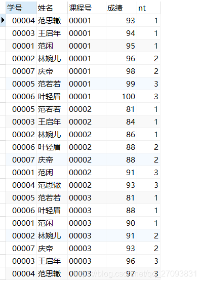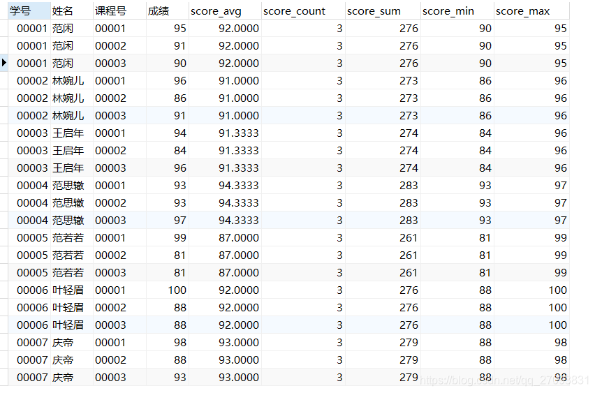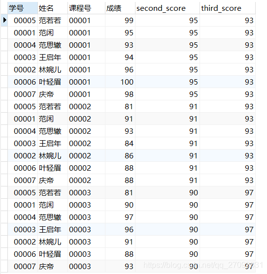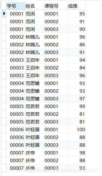 ( '0001', '范闲', '00001', '95' ),( '0001', '范闲', '00002', '91' ),( '0001', '范闲', '00003', '90' ),