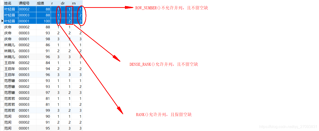 rank() | 无 | 这种排序允许并列,并且保留空缺,两个第1名,没有第2名,排名是1,1,3 |