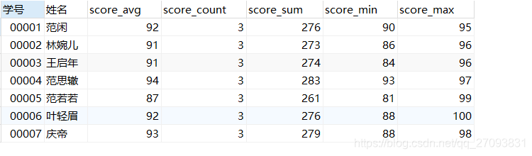 -- 求每个人成绩的均值、个数、总分、最小值和最大值
