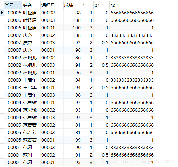 下面介绍不太常用的两个聚合函数percent_rank():累计百分比、cume_dist():累计分布值函数